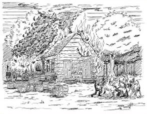 With the element of surprise on his side, Morgan’s men capture 24 linemen, along with their wagons and horses. They also capture a local miller, John Feather. Locking Feather inside the church building, which was being used by the Union linemen as storage for supplies and food, Morgan sets the building on fire.