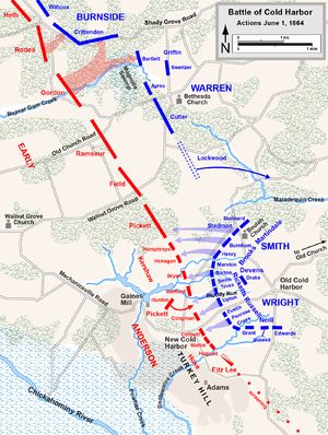 The Battle of Cold Harbor is now fully engaged along a seven-mile front. At one juncture, Union forces fiercely attack Confederate defenders, nearly breaking their lines. Elsewhere along the battle front, two small offensive attempts by the Confederates to feel out the enemy fizzle. While the rebels hold their own overall, federal troops end the day entrenched, in some instances, mere yards away from the enemy, effectively penning the Confederates in place.
